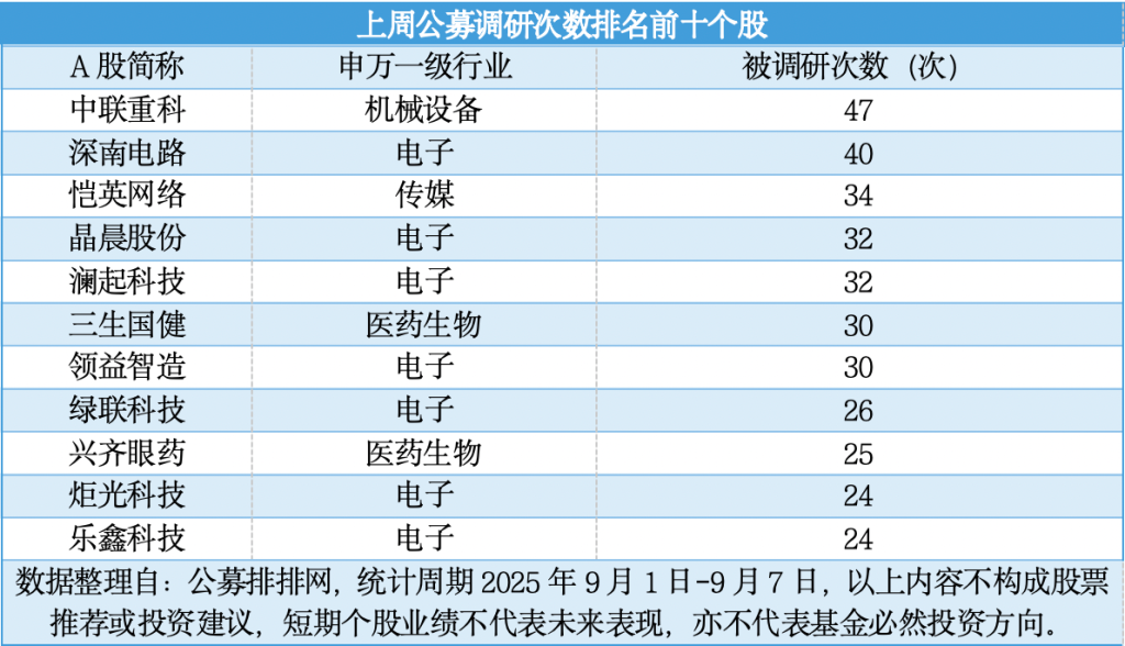 在上周公募调研次数排名前十的个股中,电子行业个股“霸榜”现象显著,同时机械设备行业的龙头企业也成为公募基金调研的“香饽饽”。