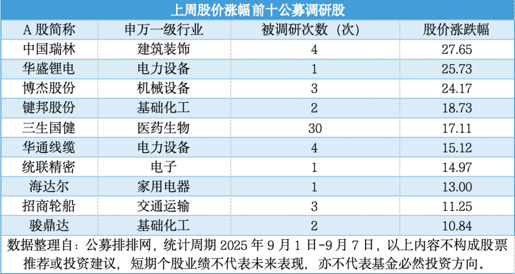 具体数据方面,建筑装饰行业的中国瑞林(603257.SH)以27.65%的股价涨幅位居榜首,尽管其被调研次数仅为4次,但短期股价表现尤为突出,成为上周公募调研股中的“涨幅冠军”,工银瑞信基金、鹏扬基金、前海开源基金和人保资产4家公募机构参与该股调研活动中。